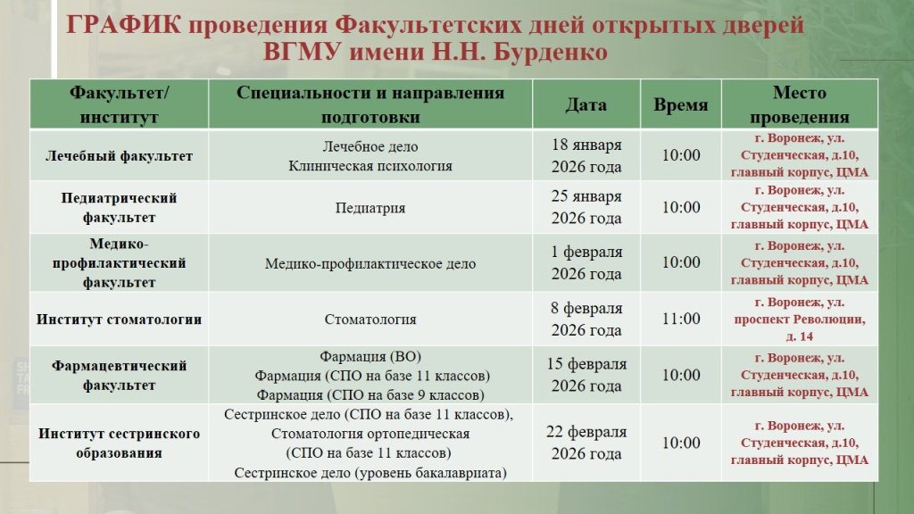 Факультетские Дни открытых дверей ВГМУ им. Н.Н. Бурденко состоятся согласно графика: