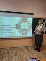 Князева А.М. 25.04.2022 года посетила МБОУ «Отрадненскую СОШ №2» Новоусманского района. В начале встречи учащимся был продемонстрирован видеофильм о ВГМУ им. Н.Н. Бурденко, который они смотрели с большим интересом. Далее доцентом кафедры была проведена профориентационная беседа со школьниками, в ходе которой была подробно изложена информация об истории вуза, существующих в настоящее время факультетах, направлениях подготовки, условиях приема в 2022 году. В завершении встречи доцент Князева А.М., ответила на все интересующие вопросы учеников об условиях приема поступления в вуз, практическом обучении, а также о возможности дальнейшего трудоустройства.