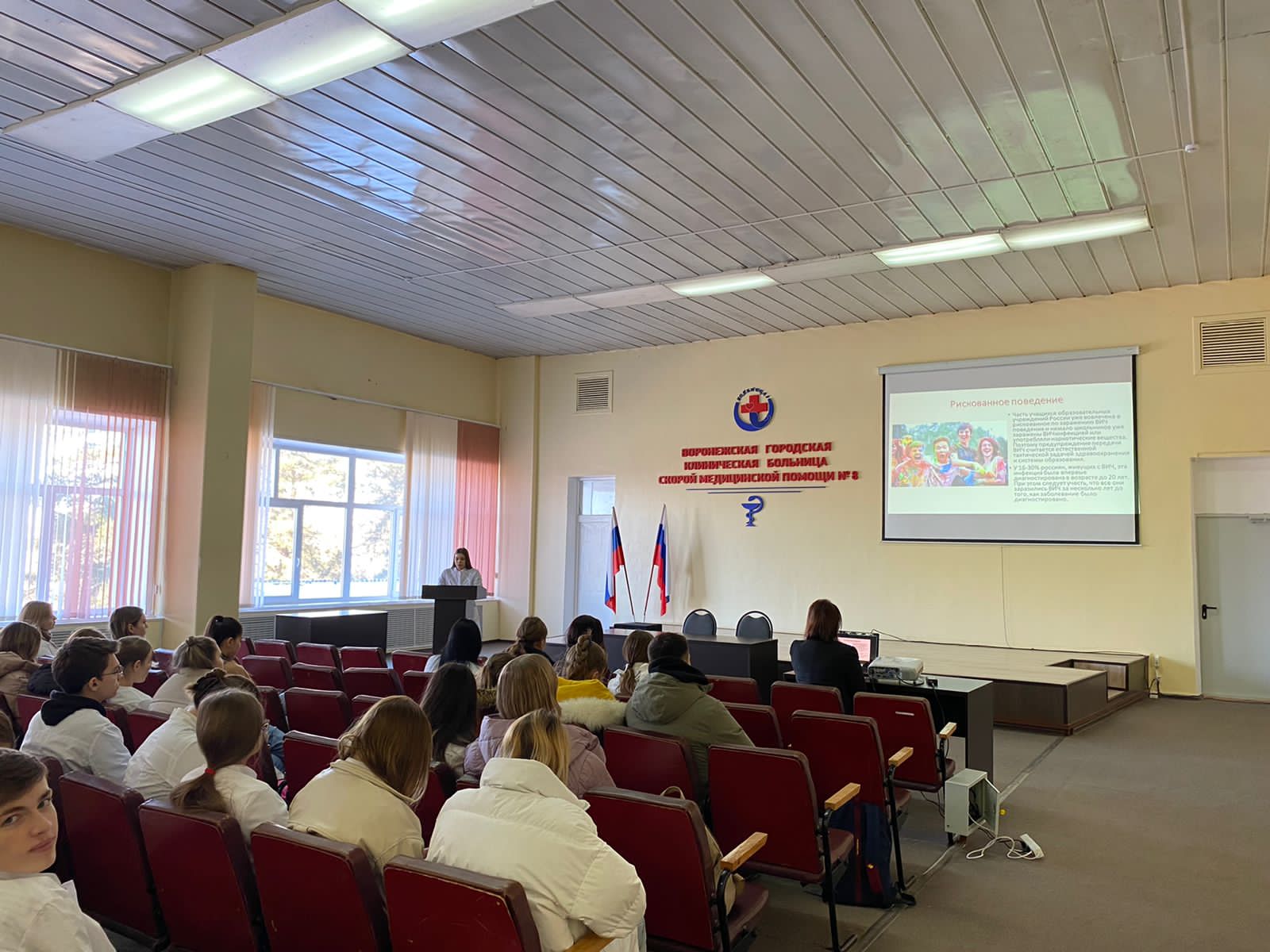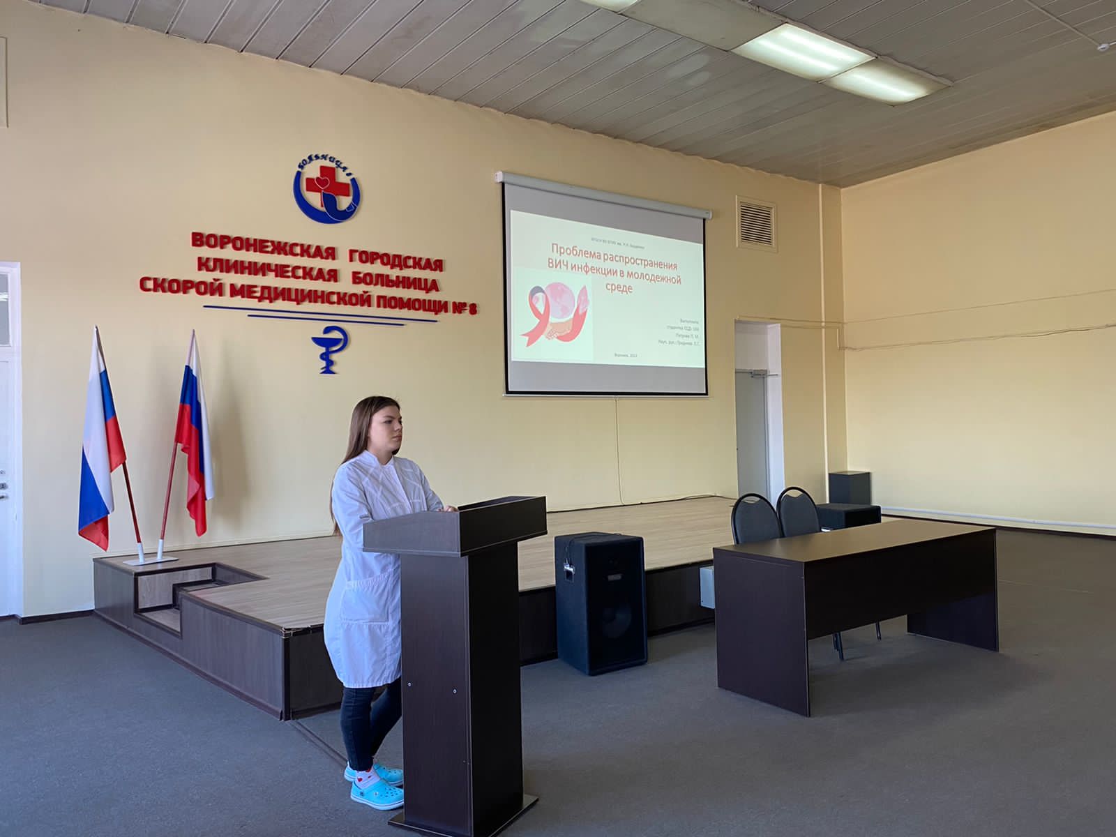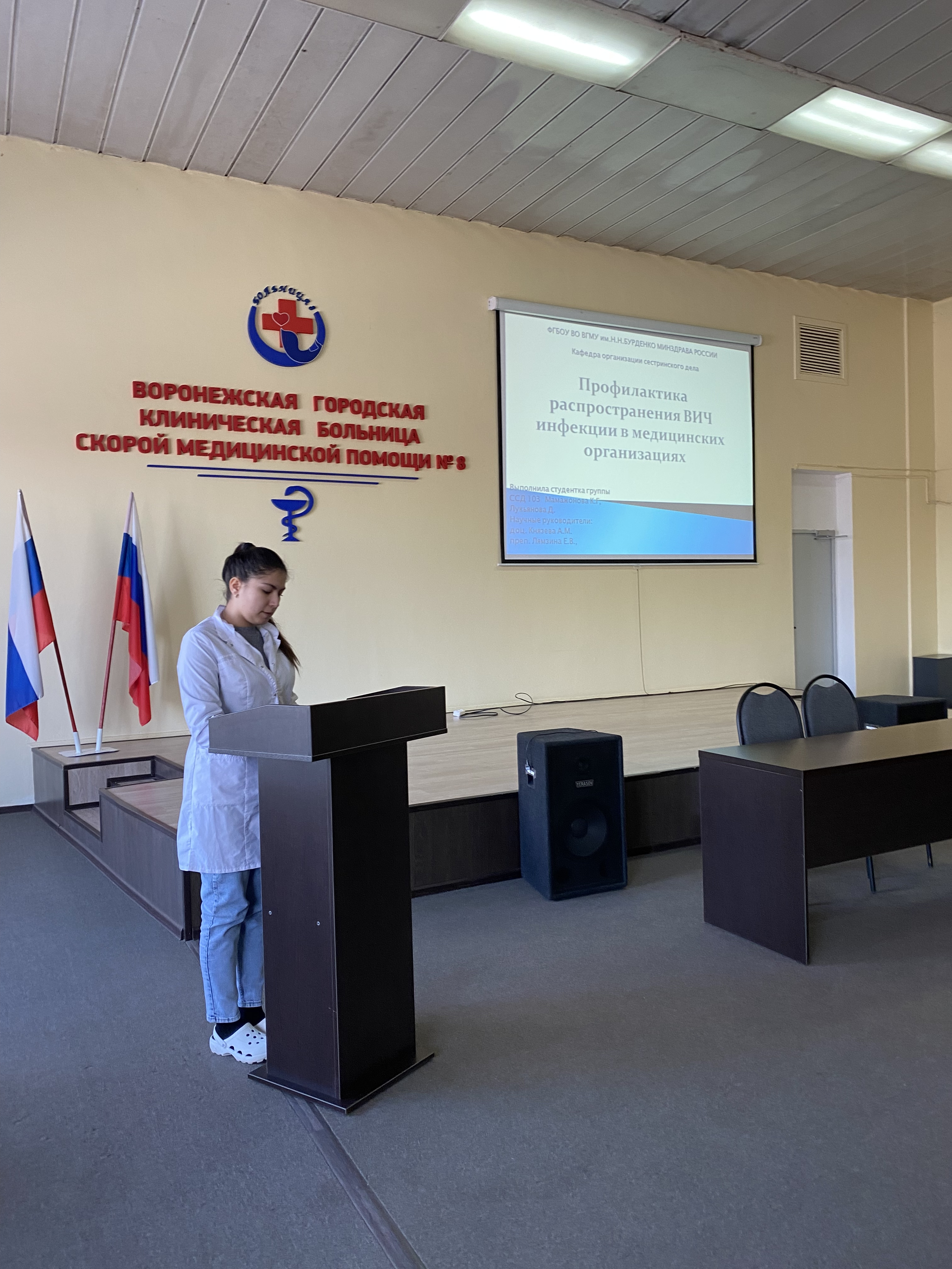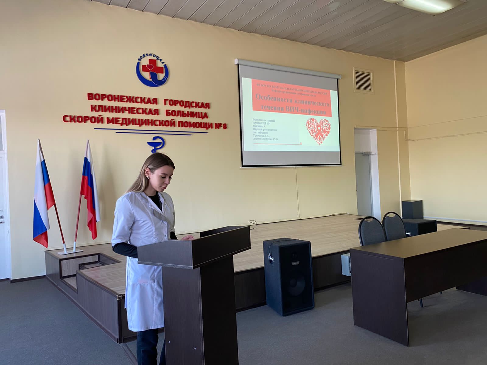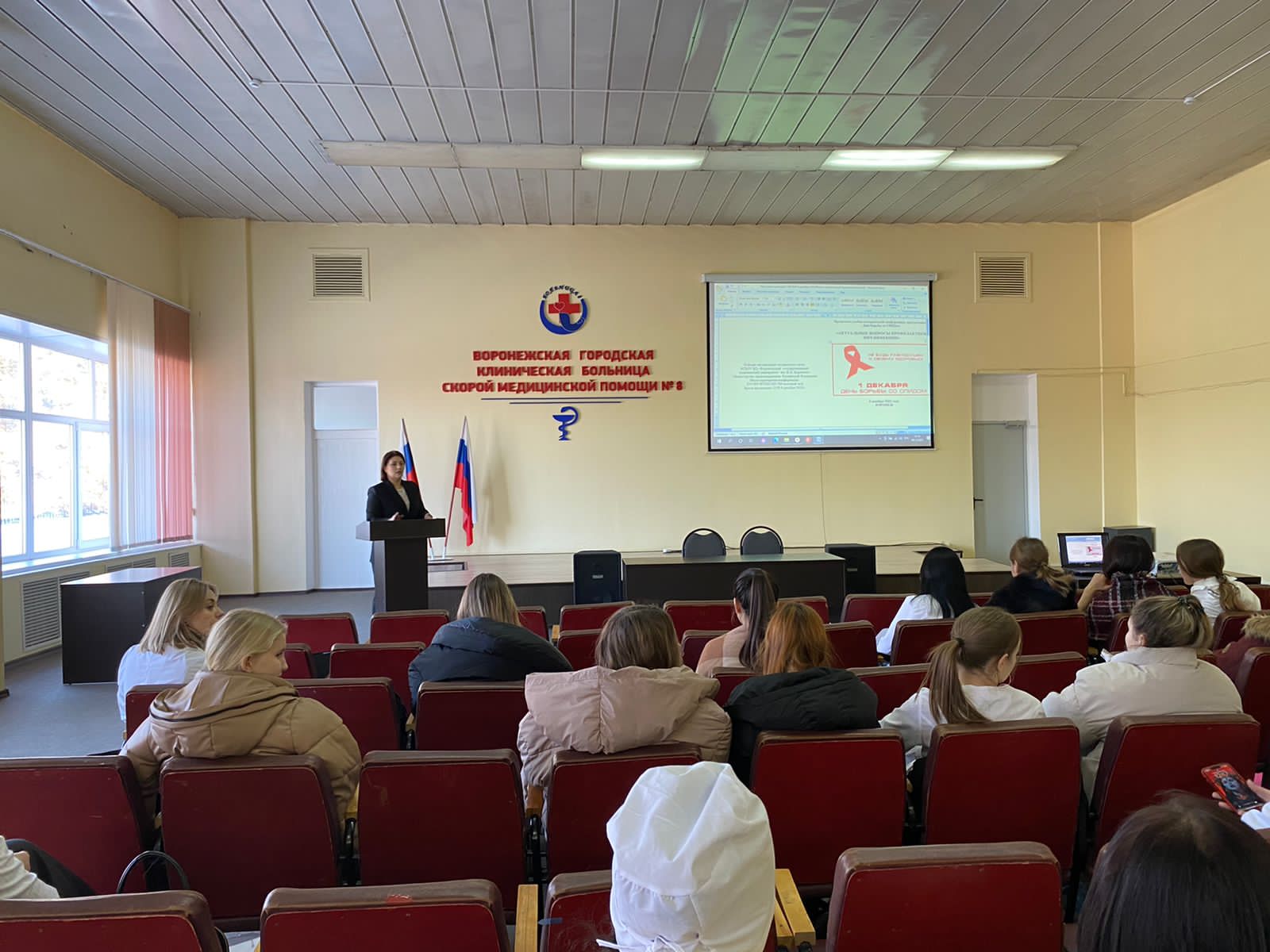 Мероприятие, приуроченное ко Дню борьбы со СПИДом, прошло 6 декабря 2022 года на базе БУЗ ВО ВГКБСМП №8. На конференции присутствовали студенты 1 курса ИСО по специальности «сестринское дело», преподаватели кафедры ОСД, а также представители практического здравоохранения – всего 54 человека.