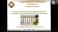 Были заслушаны и обсуждены следующие доклады: Пузин Сергей Никифорович – академик РАН, д.м.н., профессор, заведующий кафедрой гериатрии и медико-социальной экспертизы ФГБОУ ДПО «Российская медицинская академия непрерывного профессионального образования» Минздрава России, профессор кафедры спортивной медицины и медицинской реабилитации ФГАОУ ВО «Первый Московский государственный медицинский университет им. И.М. Сеченова» Минздрава России; Берсанов Руслан Увайсович – д.м.н., профессор, заведующий кафедрой общей стоматологии медицинского Института ФГБОУ ВО «Чеченский государственный университет имени Ахмата Абдулхамидовича Кадырова» «Наставничество в медицинском Институте «Чеченский государственный университет имени Ахмата Абдулхамидовича Кадырова»; Дзгоева Мадина Георгиевна – д.м.н., доцент, заведующий кафедрой ортопедической стоматологии ФГБОУ ВО Северо-Осетинской государственной медицинской академии Министерства здравохранения Российской Федерации. Хетагуров Сослан Казбекович – к.м.н., доцент, «Наставничество в Северо-Осетинской государственной медицинской академии»; Богова Ольга Таймуразовна –заведующий учебной частью, д.м.н., профессор кафедры гериатрии и медико-социальной экспертизы ФГБОУ ДПО «Российская медицинская академия непрерывного профессионального образования» Минздрава России; Потапов Владимир Николаевич – д.м.н., профессор кафедры гериатрии и медико-социальной экспертизы ФГБОУ ДПО «Российская медицинская академия непрерывного профессионального образования» Минздрава России «Наставничество в образовании ординаторов гериатров»; Попов Валерий Иванович – российский учёный-гигиенист, член -корреспондент РАН, д.м.н., профессор, заведующий кафедрой общей гигиены ФГБОУ ВО ВГМУ им Н.Н. Бурденко Минздрава России; Фертикова Татьяна Евгеньевна – к.м.н., доцент кафедры общей гигиены ФГБОУ ВО ВГМУ им Н.Н. Бурденко Минздрава России «Роль наставничества в образовательном процессе кафедры»; Маркова Светлана Васильевна заведующий музейным комплексом ФГБОУ ВО ВГМУ им Н.Н. Бурденко Министерства здравоохранения Российской Федерации «Роль музейной экспозиции в профессиональном становлении специалиста»; Мячина Ольга Владимировна – д.м.н., доцент, заведующий кафедры биологии ФГБОУ ВО ВГМУ им Н.Н. Бурденко Минздрава России «Роль наставничества в профессиональном становлении (вклад профессора А.Н. Пашкова)»; Рохманкина Марина Альбертовна – к.б.н., доцент кафедры биологии ФГБОУ ВО РязГМУ Минздрава России; Царева Оксана Альбертовна – старший преподаватель кафедры биологии ФГБОУ ВО РязГМУ Минздрава России «Кураторские чтения», как уникальная модель наставничества в вузе»; Ивлева Ульяна Александровна – студентка 1 курса института стоматологии ФГБОУ ВО ВГМУ им Н.Н. Бурденко Минздрава России, Гладышева Ольга Валериевна – к.с-х.н., ассистент кафедры биологии ФГБОУ ВО ВГМУ им Н.Н. Бурденко Минздрава России «Тревожность как фактор снижения психических процессов у студентов-медиков первого курса»; Сатина Ирина Валерьевна – к.филос.н., доцент кафедры педагогики и гуманитарных дисциплин ФГБОУ ВО ВГМУ им Н.Н. Бурденко Минздрава России; Макерова Светлана Юрьевна – к.ист.н., доцент кафедры педагогики и гуманитарных дисциплин ФГБОУ ВО ВГМУ им Н.Н. Бурденко Минздрава России «Роль наставника в реализации прое