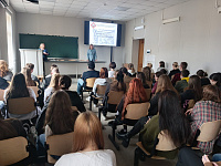 С первым докладом на конференции выступила заместитель генерального директора по фармацевтической деятельности ООО «АМП» Лариса Павловна Михина, которая рассказала обучающимся о структурных подразделениях компании, о видах ее деятельности и о возможностях профессионального развития и карьерного роста, которые предоставляет компания.