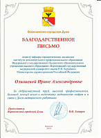 ♦ Олышева Ирина Александровна – к.м.н., доцент кафедры терапевтических дисциплин ИДПО – Благодарственным письмом Воронежской городской Думы;