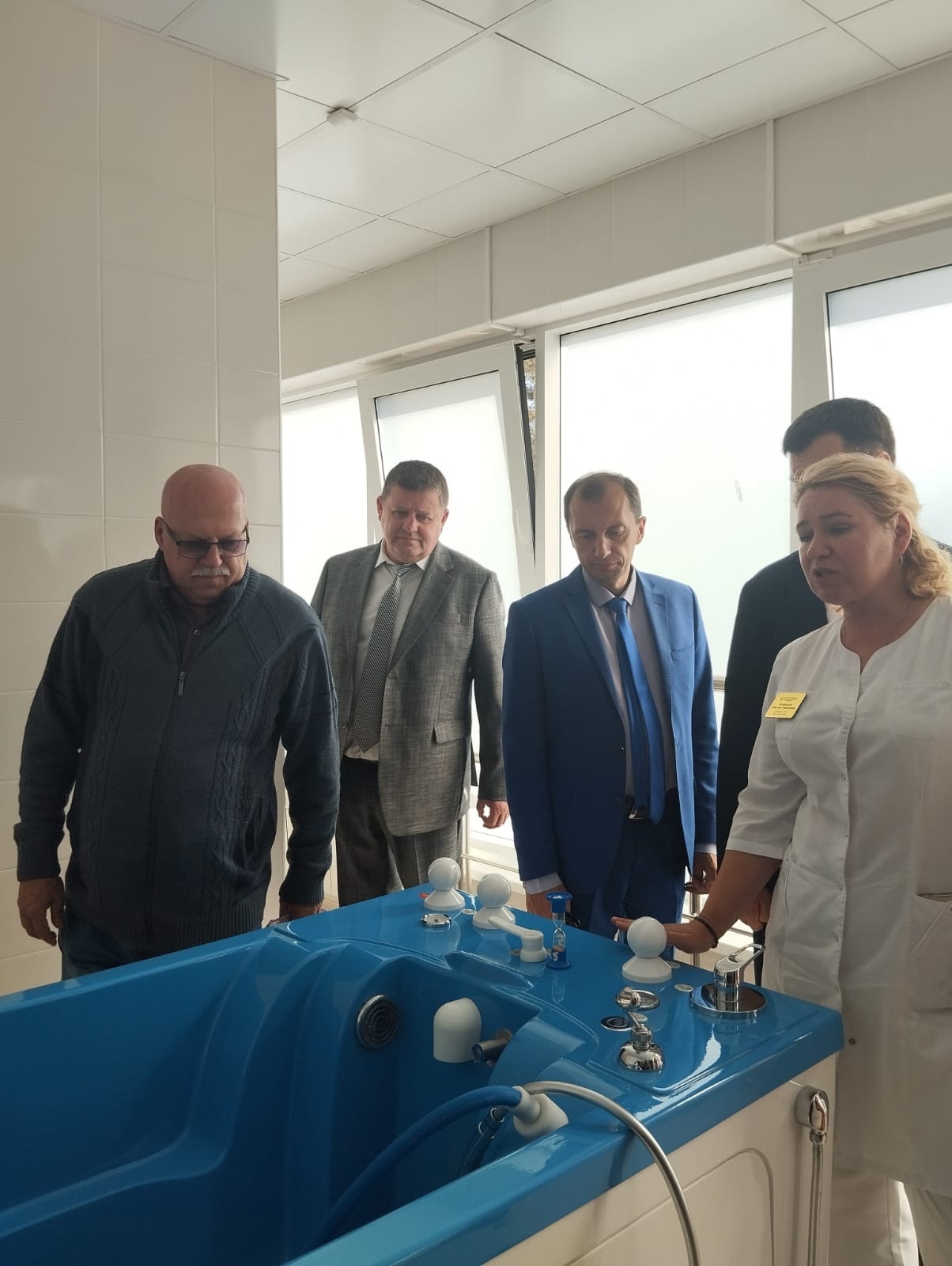 - ознакомление сотрудников кафедры с физиотерапевтическим отделением, водолечебницей и грязелечебницей, оценка условий для проведения курсов физиотерапии, водной терапии и лечебной физкультуры. Особое внимание уделено залам ЛФК, современным тренажёрным комплексам и мультимедийным системам, включая виртуальную реальность, применяемую в реабилитации пациентов с двигательными и когнитивными нарушениями. Подчёркнуто, что данные технологии необходимы для оптимизации восстановления после травм, тяжёлых заболеваний и несения службы в условиях особых нагрузок.