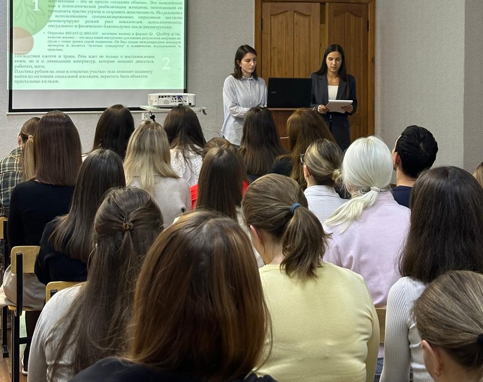 «Ранняя диагностика заболеваний молочной железы важность диспансеризации и профилактических медицинских осмотров». С этим докладом выступили Балиашвили Дмитрий Иванович - доцент кафедры, Анохина Юлия Михайловна - ассистент кафедры, Акулова Мария Сергеевна, Корниенко Алина Сергеевна – студентки педиатрического факультета.