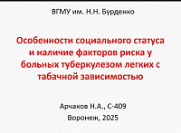 Второе заседание студенческого научного кружка с участием студентов лечебного, педиатрического и стоматологического факультетов было посвящено различным аспектам стоматологической помощи больным туберкулёзом и противотуберкулёзной помощи, что нашло своё отражение в докладе «Оказание стоматологической помощи пациентам с туберкулёзом» (студент Джалилов Ф.Т.). Особенностям эпидемиологии туберкулёза и основных проблемах, стоящих на пути по искоренению данного инфекционного заболевания, были посвящены доклады «Туберкулез в наши дни» (Галочкин В.В.) и «Современные проблемы туберкулеза и пути их решения» (Семирозуб Д.Д.). Социальный статус больного туберкулёзом, вредные привычки и их влияние, в том числе на местный иммунитет органов челюстно-лицевой области, были наглядно представлены в докладах «Особенности социального статуса и наличие факторов риска у больных туберкулезом легких с табачной зависимостью» (Арчаков Н.А.) и «Влияние алкоголя на полость рта» (Троценко С.А.).