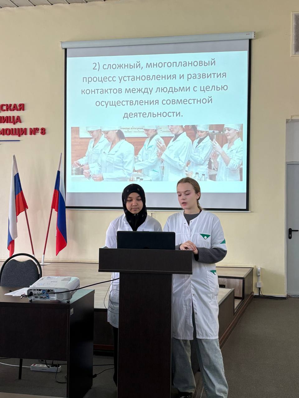 4. «Общение в сестринском деле». Докладчики: Бурмистрова А.М., Абдувохидова С.А., студентки 1 курса ССД 101 группы.