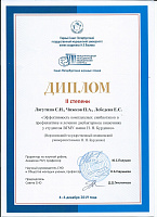 Студенты 5 курса, лечебного факультета ВГМУ им. Н.Н. Бурденко Лагутина С. Н. и Чижков П. А. на конгрессе представили свою работу «Эффективность комплексных синбиотиков в профилактике и лечении дисбактериоза кишечника у студентов ВГМУ имени Н. Н. Бурденко», проделанную на базе кафедры микробиологии, факультетской терапии. Наши обучающиеся были удостоены почетного II места. Ребята достойно справились с поставленной задачей и защитили честь нашего вуза. Поздравляем призеров и желаем дальнейших побед!