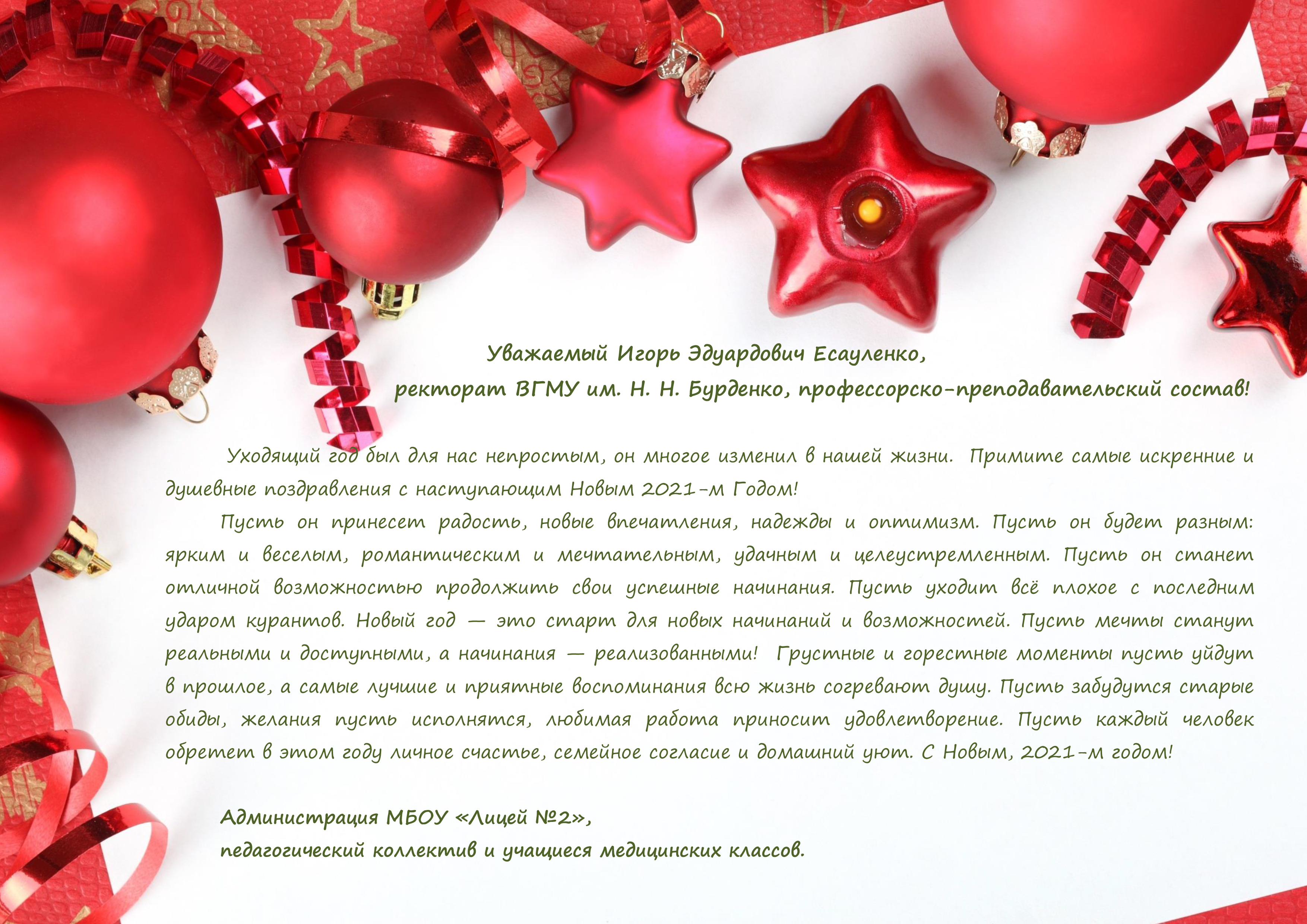 В адрес ректора ВГМУ им. Н.Н. Бурденко поступают новогодние поздравления не только от зарубежных и российских партнеров, с которыми у медуниверситета сложились давние и прочнее связи. Добрые слова звучат и в поздравлениях руководителей отделов образования и директоров средних учебных заведений, чьи сегодняшние питомцы уже выбрали свой жизненный путь и стали слушателями факультета довузовского образования.
