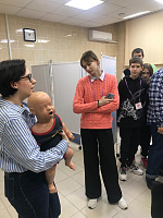 Далее школьники побывали в Федеральном мультипрофильном аккредитационно-симуляционном центре Воронежского государственного медицинского университета имени Н.Н. Бурденко. Сотрудники кафедры симуляционного обучения асс. Журомская А.А. и асс. Сергеева О.С. провели экскурсию по виртуальной клинике федерального мультипрофильного аккредитационно-симуляционного центра. Преподаватели провели мастер-классы со школьниками, были рассмотрены ситуации, когда человеку необходимо оказание экстренной помощи до приезда «скорой». Ребята на манекенах-тренажерах отработали навыки приёмов удаления инородного тела из верхних дыхательных путей с пошаговым алгоритмом действий (приём Геймлиха), а также технику внутривенного введения лекарственного препарата.