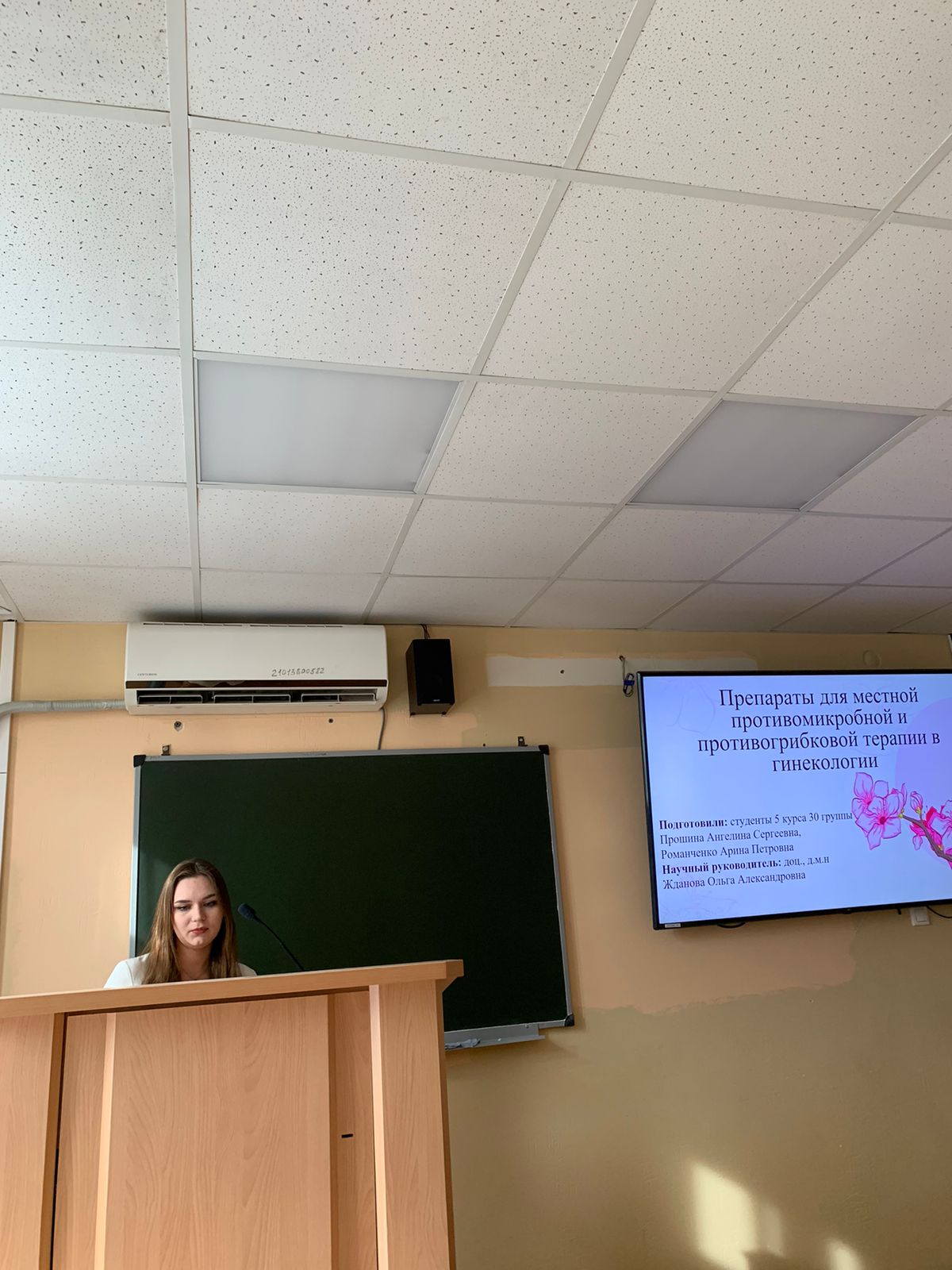 Третий доклад «Препараты для местной противомикробной и противогрибковой терапии в гинекологии» зачитали Прошина Ангелина и Романченко Арина из группы Л-530.
