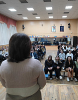 Сомова М.Н. подробно рассказала присутствующим об истории нашего вуза, выдающихся выпускниках, о структуре университета, имеющихся факультетах, знаниях и умениях, которые необходимы будущим врачам, перспективах карьерного роста, открывающихся по окончании обучения. Кроме того, были подробно рассмотрены вопросы приемной кампании: виды вступительных испытаний, перечень документов для поступления, перечень учитываемых дополнительных достижений. Отдельный акцент был сделан на возможности целевого обучения, порядок подачи заявок на целевое обучение с использованием сервиса «Работа в России», преимущества данного формата для получения образования по желаемой специальности.