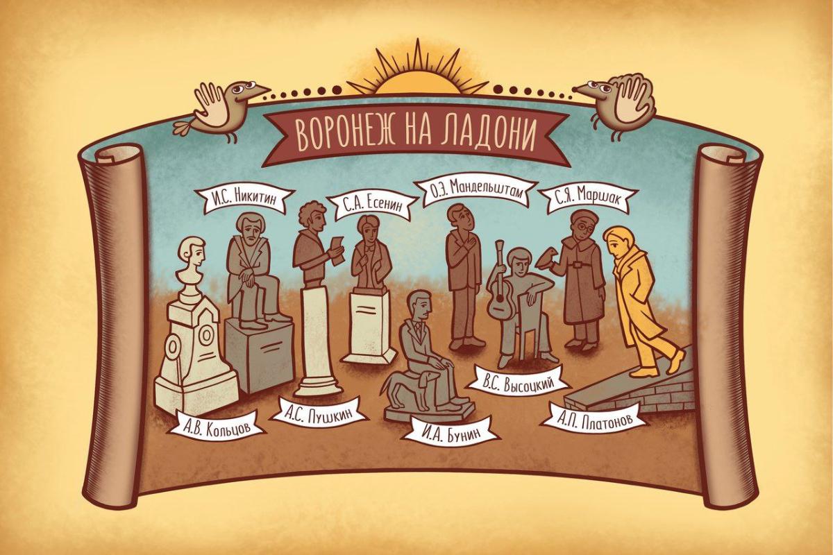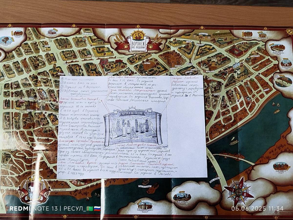 В-третьих, студенты из Туркменистана, обучающиеся в группах довузовской подготовки, приняли участие в литературном лингвострановедческом мероприятии, организованном куратором Н.А. Шишаковой. Наталья Александровна использовала авторскую карту «Воронеж на ладони» иллюстратора и дизайнера Марины Демченко, в которой отмечены достопримечательности, музеи, театры, галереи Воронежа. Ребята «прошли» пешеходным маршрутом по центру города, познакомились с его достопримечательностями, а затем, используя открытку этого же автора, систематизировали все памятники поэтам, писателям и их героям, вспомнили о памятнике Г.Н. Троепольскому, который не отмечен на карте, но находится в шаговой доступности от студенческого общежития №3.