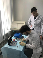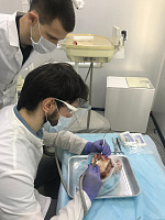 В рамках подготовки ко второму и третьему этапу олимпиады в г. Москве под руководством профессора кафедры хирургической стоматологии, д.м.н. Н.С. Азаровой были рассмотрены клинические случаи из практической лечебной деятельности по направлению хирургической стоматологии: онкопатология, заболевания слизистой оболочки полости рта и дентальная имплантация, проведены практические мастер-классы на свиных головах по отработке навыков сложного удаления зубов, пластического закрытия ороантрального соустья с последующим наложением швов, а также резекция верхушки корня и пластика рецессии десны. Также со студентами отработаны практические навыки установки дентальных имплантатов системы Xive (Германия) на фантомах челюстей.